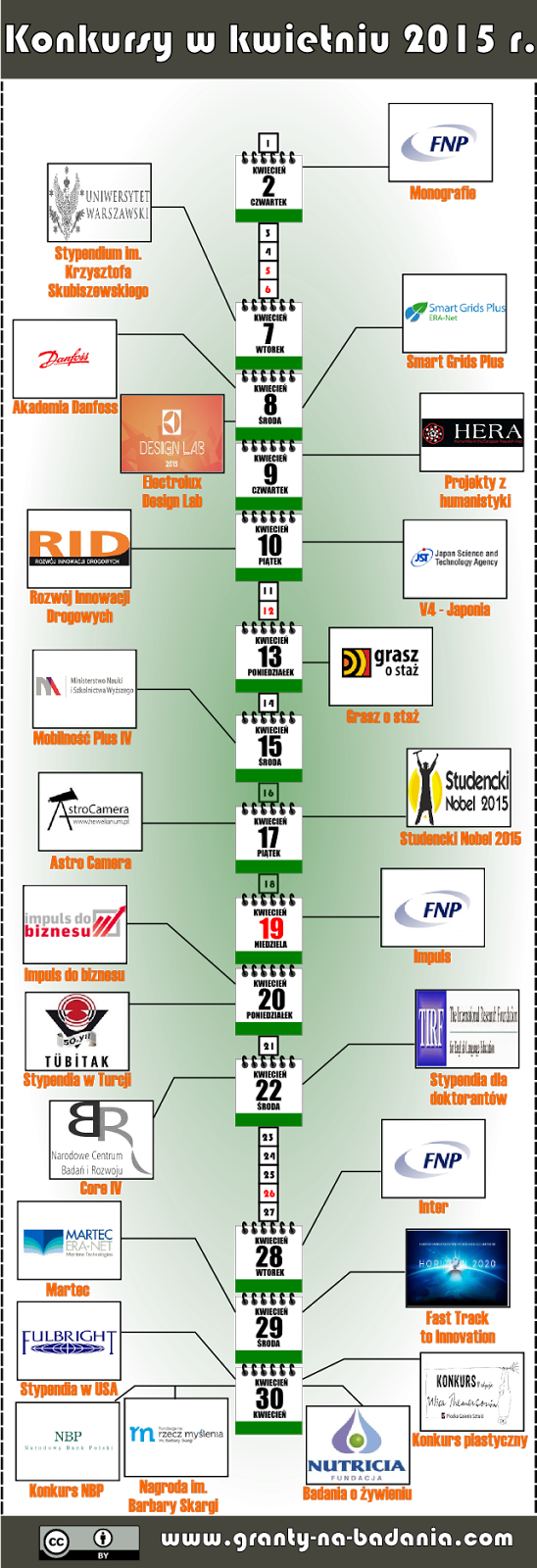 Kwiecień to okazja na wiosenną ofensywę w zdobywaniu środków na badania naukowe. Już dziś wiemy, że w w najbliższym miesiącu zamknięty zostanie nabór w blisko 30 konkursach. Ponieważ jednak znalezienie odpowiedniego dla siebie konkursu, może być nieco trudne, tradycyjnie serwis granty-na-badania.com przygotował infografikę, której celem jest przedstawienie konkursów.