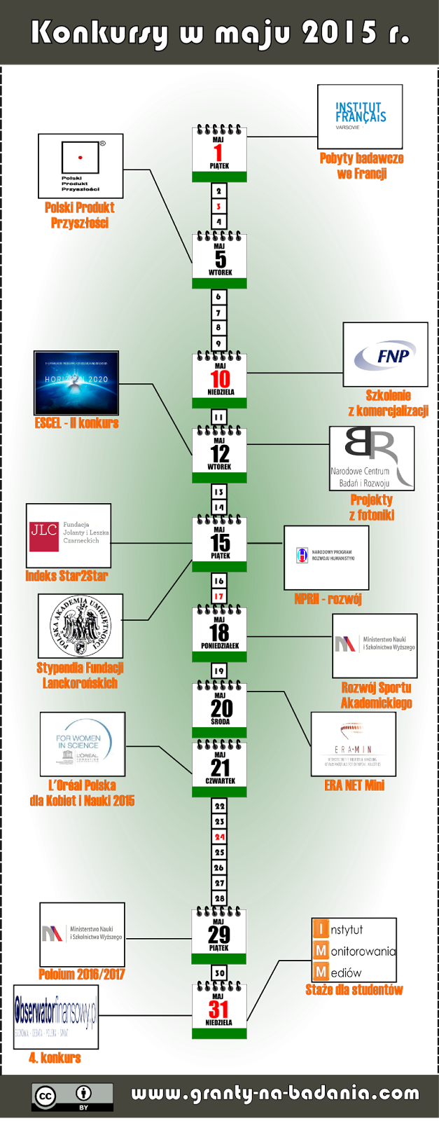 Maj to kolejna okazja na zdobycie środków na badania naukowe. Już dziś wiemy, że w w najbliższym miesiącu zamknięty zostanie nabór w blisko 20 konkursach. Ponieważ jednak znalezienie odpowiedniego dla siebie konkursu, może być nieco trudne, dlatego też tradycyjnie granty-na-badania.com przygotowały infografikę, której celem jest przedstawienie konkursów.