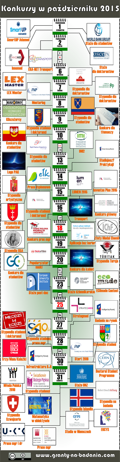 Październik to powrót na uczelnie i do pracy naukowej. Wracać tym bardziej warto, że w najbliższym miesiącu zamknięty zostanie nabór wniosków w blisko 60 konkursach. Ponieważ jednak znalezienie odpowiedniego dla siebie konkursu, może być nieco trudne, tradycyjnie serwis granty-na-badania.com przygotował infografikę, której celem jest przedstawienie konkursów.