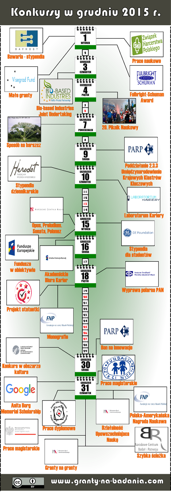 Grudzień to nie tylko koniec roku. To także doskonała okazja do złożenia wniosku o grant, stypendium oraz staż. Ponieważ jednak znalezienie odpowiedniego dla siebie konkursu, może być nieco trudne, tradycyjnie serwis grany-na-badania.com przygotował infografikę, której celem jest przedstawienie konkursów.